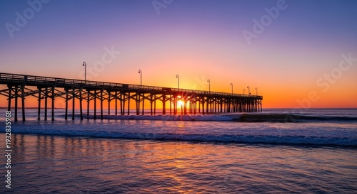 Fototapeta premium A wooden pier extends into the ocean at sunrise, casting long shadows with a...