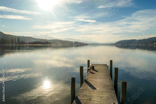 Fototapeta premium A wooden pier going into the lake, with Alps in the back. The calm surface of the lake is reflecting the mountains, sunbeams and clouds. Clear and sunny day. Few ducks standing at the promenade