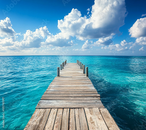 © Aisyaqilumar, Obraz premium A wooden pier is in front of a beautiful blue ocean. The sky is cloudy, but the water is calm and clear.