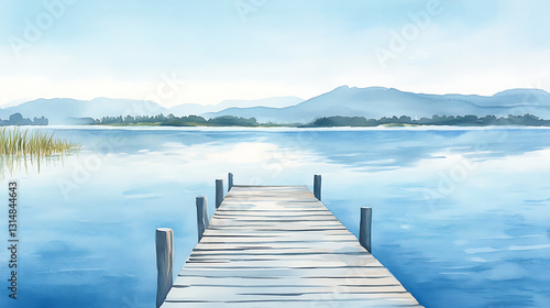 © Watcharin, Naklejka premium A wooden pier is in front of a body of water