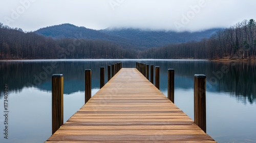 Naklejka premium A wooden pier stretches into a tranquil lake surrounded by misty mountains,...