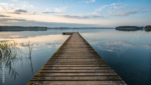 © RATUL HASAN, Fototapeta premium A wooden pier stretches out into the calm lake under a serene sky at sunrise, reflecting the soft light and clouds on the waters surface