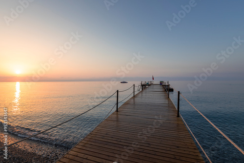 © Sergei, Obraz premium A wooden pier with a boat in the water