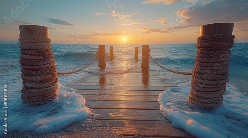 © Thanaporn, Fototapeta premium A wooden pier with a rope bridge over the water