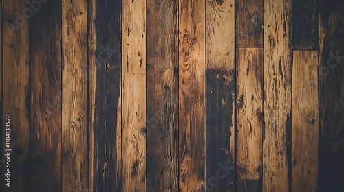 © WINGGOD, Naklejka premium A wooden plank wall with natural knots and grain patterns, creating a rustic look