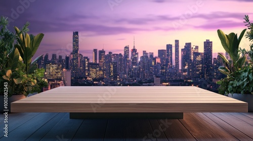 © BerkahStock, Obraz premium A wooden platform in front of a city skyline at sunset, surrounded by greenery.