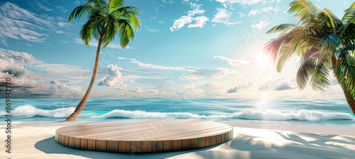 Obraz premium A wooden podium sits on a pristine beach under the shade of swaying palm trees, overlooking a turquoise ocean with waves gently lapping at the shore