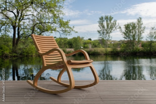 © kornc, Fototapeta premium A wooden rocking chair is sitting on a dock by a lake