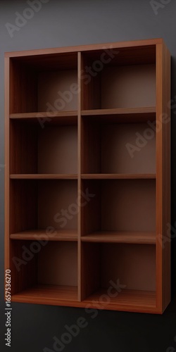© trustmastertx, Fototapeta premium A wooden shelving unit with eight empty compartments against a dark, neutral-toned wall