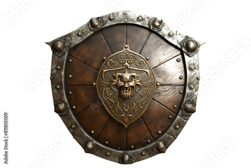 © Ps_Studio21, Fototapeta premium A wooden shield with a metal rim and a lion's head in the center. The shield is brown and the metal is black.