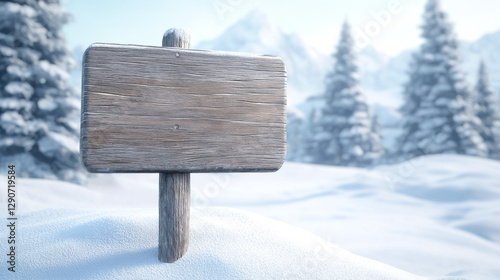 © enterdigital, Fototapeta premium A wooden signpost standing in a snowy landscape with evergreen trees in the background.