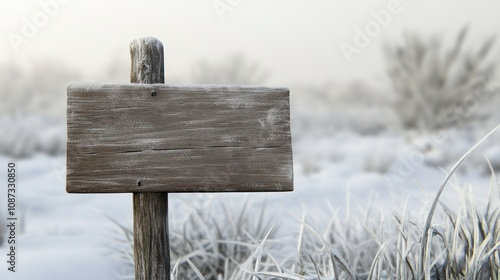 Naklejka premium A wooden signpost stands in a snowy landscape, surrounded by frosted grasses...