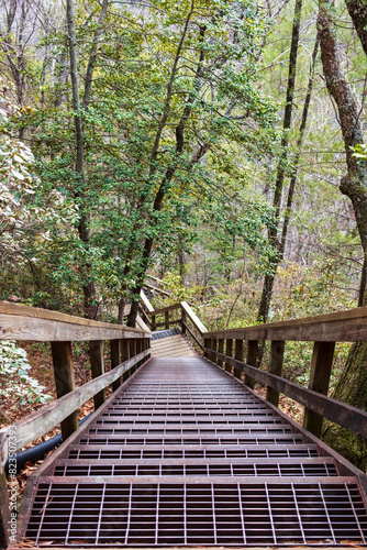 Fototapeta premium A wooden staircase with a metal grate in between