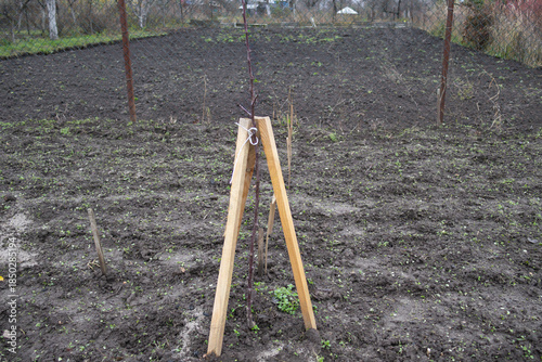 © Sasha, Fototapeta premium A wooden support holds up a young plant in a field that is ready for planting new crops in the spring season