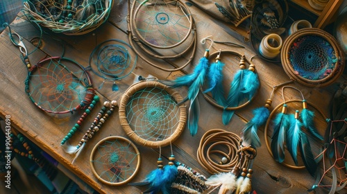 © Darya, Fototapeta premium A wooden table is filled with colorful supplies for crafting dreamcatchers, showcasing various materials and vibrant feathers in a creative workspace