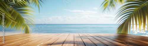 © Vitalii Shkurko, Fototapeta premium A wooden table stands ready for product display with palm leaves framing a view of the calm sea and blue sky at a tropical beach. Perfect for summer vacation vibes