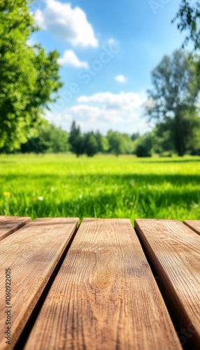 Fototapeta premium A wooden table top with a blurred background of a green meadow and blue sky.
