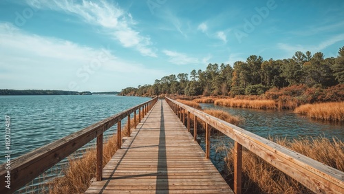 © Lasvu, Naklejka premium A wooden walkway extending into the distance across a lake with forested shoreline and a partly cloudy sky.