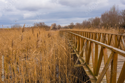 © dragoncello, Fototapeta premium A wooden walkway in the Kopacki Rit Nature Reserve in winter in north east Croatia. Located by the Serbian border, close to the confluence of the Drava and Danube rivers, it is one of the largest and