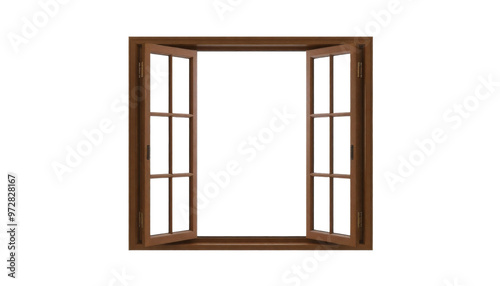 © Prompt2image, Obraz premium A wooden window frame with open double sash showcasing a clear background for versatile design use