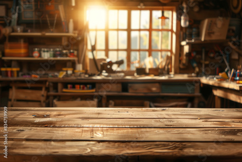 Fototapeta premium A wooden workbench in the foreground with a blurred workshop in the background
