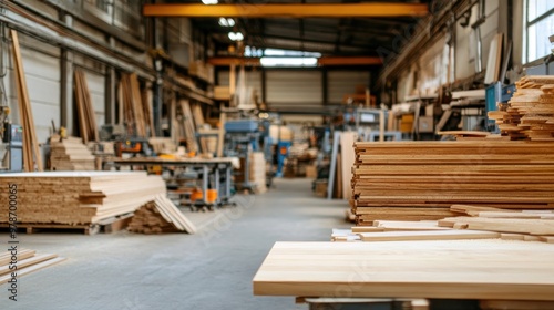 © AURA COLLECTIONS, Obraz premium A wooden workshop filled with lumber and machinery for woodworking projects.