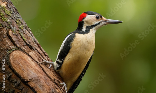 © Pasha, Naklejka premium A woodpecker is perched on a tree branch, ready to fly away