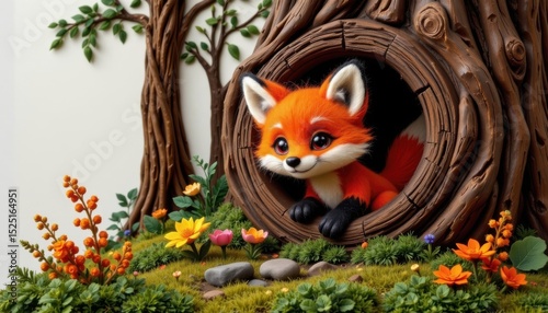 Fototapeta premium a wool felt art showing a playful red fox kit peeking out from a hollow log in a dense forest