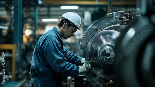 Fototapeta premium A worker in a factory meticulously assembling machinery components.