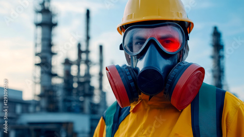 Naklejka premium A worker in safety gear stands against an industrial backdrop, wearing a gas...
