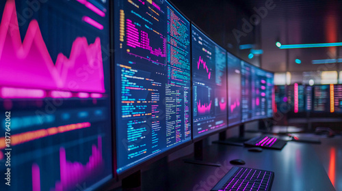 © Alex Alex, Obraz premium A workstation with multiple monitors displaying graphics and program code. The lighting in the room is neon.