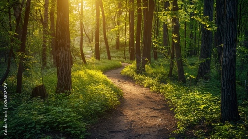 © Alexander Chaykin, Fototapeta premium A worn dirt path winding through dense forest foliage