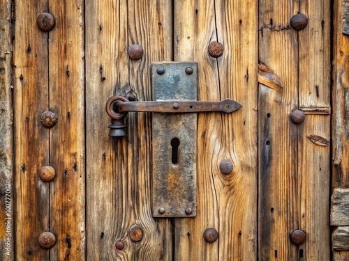 © Danicha, Fototapeta premium A worn, rustic wooden door with old-fashioned iron hinges and a large keyhole, weathered to perfection, stands slightly