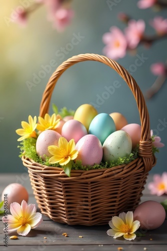 Naklejka premium A woven basket overflowing with vibrant Easter eggs and spring blossoms ,...