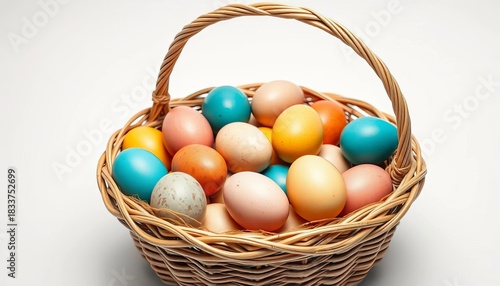 Naklejka premium A woven basket overflowing with vibrantly colored eggs sits on a pristine white background, colorful, painted eggs