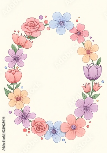 Fototapeta premium A wreath of hand-drawn whimsical flowers in pastel shades encircling a blank text area
