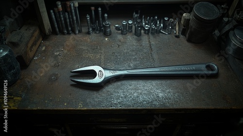 Fototapeta premium A Wrench on a Metal Workbench with Scattered Tools