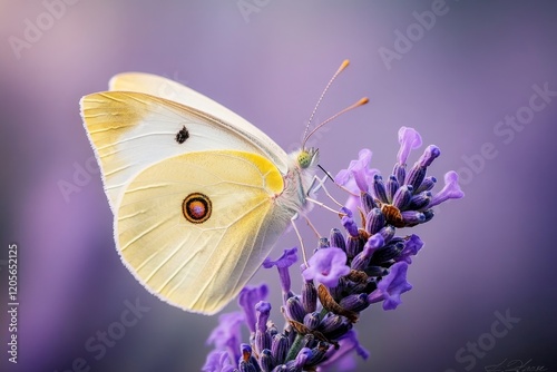 © Thanyarat, Naklejka premium A xanthous butterfly resting on a purple lavender flower, with intricate details of its wings visible