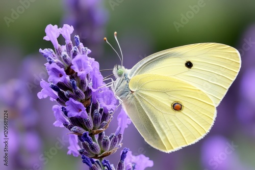 © Thanyarat, Naklejka premium A xanthous butterfly resting on a purple lavender flower, with intricate details of its wings visible