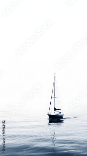 © Anastasia, Fototapeta premium A yacht sailing on a serene white sea with soft ripples and distant hills shrouded in mist creates a tranquil and peaceful scene