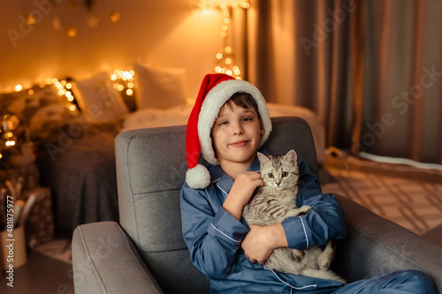 © Daria, Obraz premium a 10-year-old boy in blue pajamas and a red Christmas cap is holding a small British kitten in his hands. decorated room with magical christmas lights