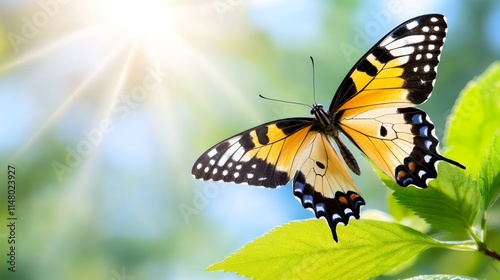 Obraz premium A yellow and black butterfly sitting on a green leaf