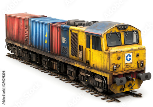 © Bonya Sharp Claw, Obraz premium A yellow and blue train with cargo containers on the sides, isolated on a white background. 3D rendering illustration