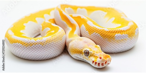 Fototapeta premium A yellow and white snake resting on a white surface. Suitable for reptile...