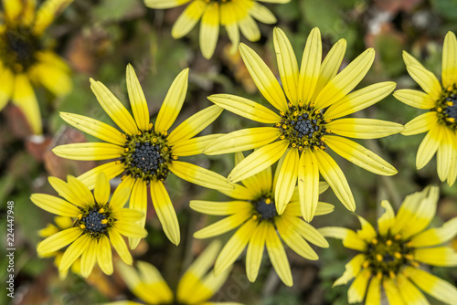 Fototapeta premium A yellow Arctotheca Calendula flower with its pistils, pollen and leaves...