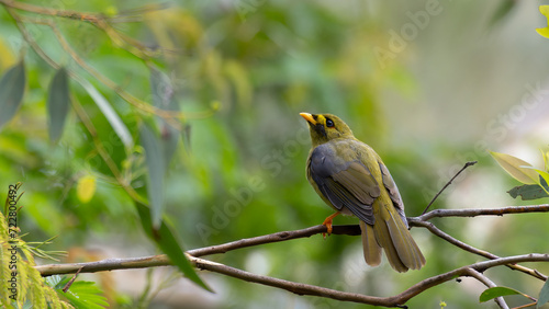 Fototapeta premium a yellow bird on a tree branch in the rain with trees and leaves in the