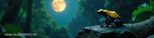 Fototapeta premium A yellow black poison dart frog perches on a flat rock in the rainforest under a full moon, rainforest landscape, wildlife photography, nature at night