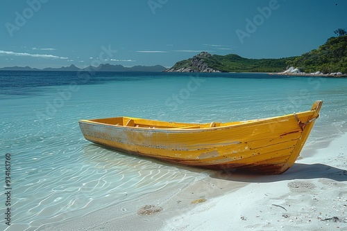 © Graph Squad, Naklejka premium A yellow boat is sitting in the water near the shore