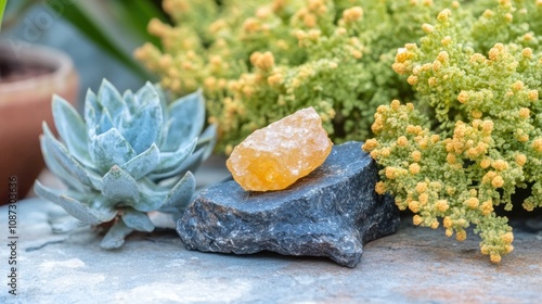 Fototapeta premium A yellow crystal on a stone surrounded by succulents and vibrant yellow flowers.