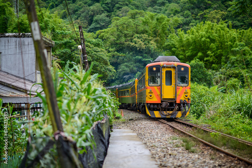 Naklejka premium A yellow diesel train is driving in the mountains and forests. Along the Pingxi line, there are river valleys, potholes and waterfalls. Taiwan